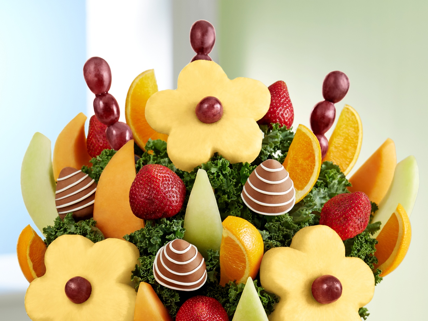 Click HereFruitBouquets.com offers a delicious assortment of fresh fruit arrangements, chocolate dipped fruits and more tasty gifts delivered! Each fruit arrangement is hand crafted with the utmost of care and with the freshest fruit to deliver a 100% smile guarantee. Our talented designers have been trained to make sure each fruit arrangement looks and tastes good enough to eat! Get gift ideas for the entire family from fruit arrangements for mom & dad to chocolate covered strawberries for siblings. Whether you're looking for birthday fruit arrangements or to send a gift just because, we offer the perfect fruit gifts for delivery for all occasions.