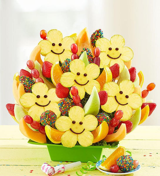 Big on fun, big on yum! Our party-ready fruit arrangement is filled with a mouthwatering mix made for sharing: dipped strawberries rolled in colorful confetti sprinkles, plump grapes, melon and more. And to really get everybody smiling, we’ve added happy face pineapples shaped like adorable daisies.